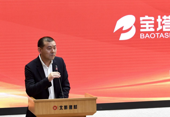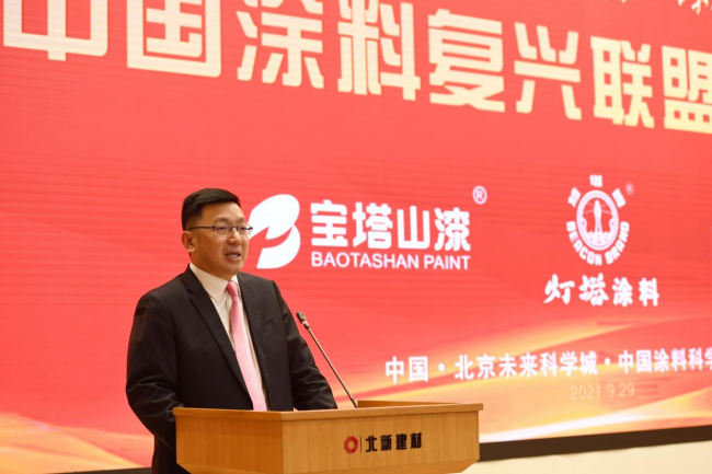李斌作为联盟企业代表发言。他代表宝塔山和西部地区涂料企业感谢中国涂料工业协会和北新建材为涂料行业提供了一个交流学习、合作共享的组织。宝塔山也将为中国涂料的复兴和中华民族的伟大复兴贡献自己的力量。
