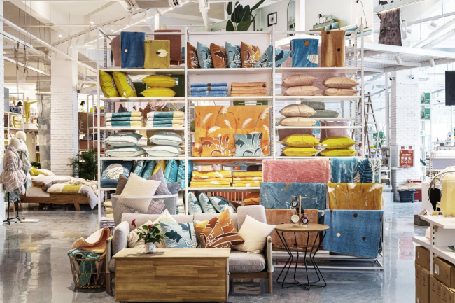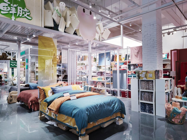 其次,该店商品分区十分完善。为了让消费者更加清晰直观地在店内找到自己的购物需求,2400㎡的远梦家居生活馆2.0总共被分为套件区、被芯区、床垫区、青少年区、婚庆区、轻奢区、服装区、小纺区、卫浴区、毛巾区、家杂区、绿植区等等不同区域。