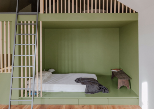 绿色是通透的。踏入家门就有一种轻快感,让空间稳重下来,再搭配富有造型感的木质线条,原木与绿色是点睛之笔,赋予空间自然沉稳的基调,展现浑然天成的意境之美,宛如置身画廊之中。上下铺的设计减少空间的压抑感和拥挤感,提升空间的通透性,让居住者在视觉上没有限制,幸福感油然而生。