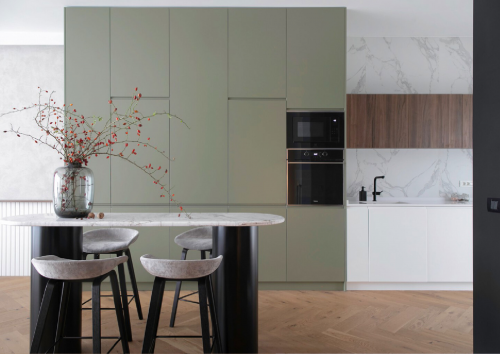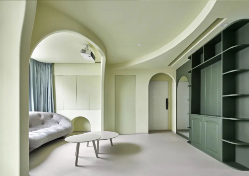 绿色是稳重的。设计师反对繁琐的造型,以简单的线条,质朴的配色,创造空间的同时,也用一抹低饱和度的绿色,搭配温润的木色,家的温馨感与时尚感便应运而生,为灰白色为主色调的空间注入青春活力的气息。