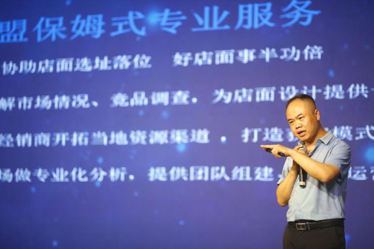 他给出八大保障系统,确保经销商开店无忧,分别是:招商加盟、建店系统、培训系统、运营帮扶系统、品牌营销系统、新零售系统、产品研发设计、客户服务系统。