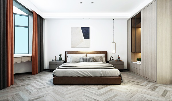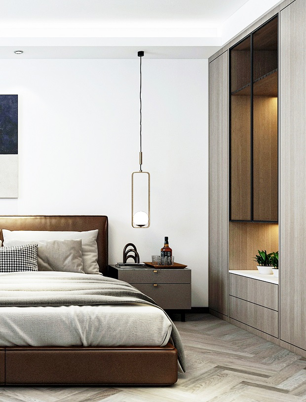 主卧延续了整个住宅轻奢优雅的调性,简明的线条搭配朴质的衣柜写下了空间质感,舒适的床品代表着生活的细腻柔情,搭配灯光设计,在这个空间的体验就是一首动人优美的旋律,值得回味和依恋。