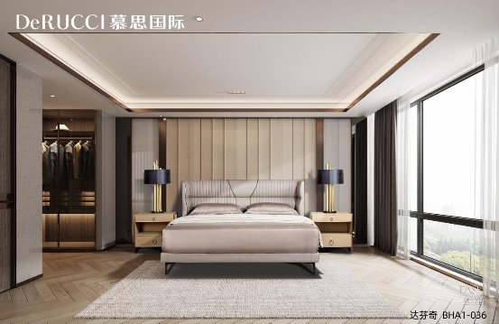 慕思国际BHA1-028阿奎拉因对物件的极致匠心而生。高达160cm的床屏,平滑极简的线条感,对床具制作师的工艺和纳帕真皮原料的要求达到近乎严苛的高度。必须采用颜色一致、纹理一致、没有破损瑕疵的大块真皮,配上制作师高超的制作技艺,才能保证整张床平滑美观。别墅空间的设计与此有异曲同工之处,极宽敞的空间里,如何保证细节与整体的一致,保证空间的对话,设计师对空间调性和产品品味的把控,显得尤为重要。