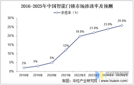 根据华经产业研究院《2021中国智能门锁行业白皮书》,2018年至2021年,中国智能锁渗透率稳步且迅速地增长。2021年中国智能锁一二线城市渗透率达到12%,预测2025年,一二线城市渗透率将达25.9%。