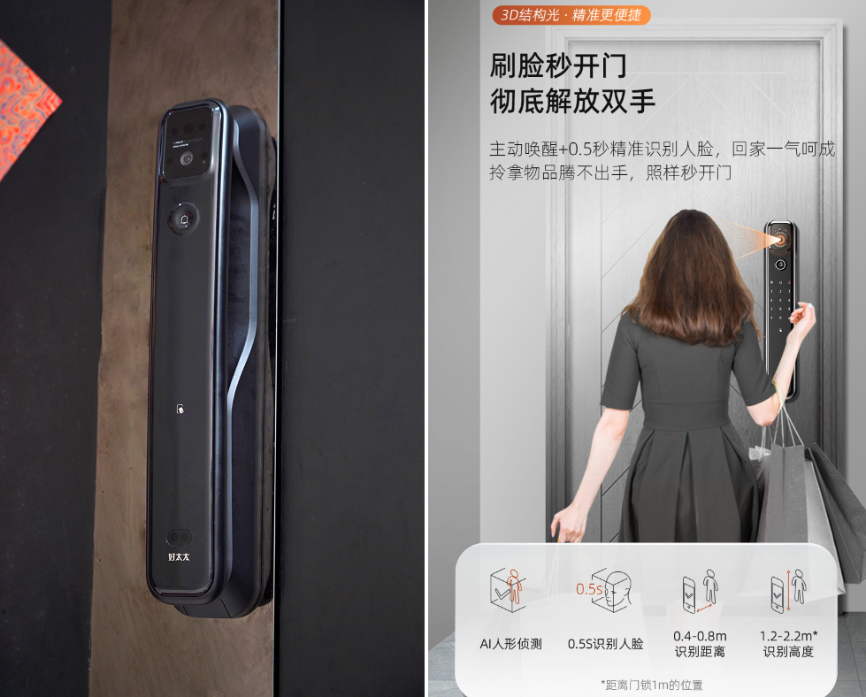 好太太自研锁体所体现出的,正是高端智能锁品牌和普通品牌的差异。无论硬件配置还是开锁方式,高端品牌比起普通品牌,都更愿意花费大量时间去从事智能锁核心技术的研发。比如在开锁方式上,好太太近期发布的智能锁V86MAX就加入了3D结构光人脸识别技术,深化了智能锁在进行人脸识别时的安全性及识别效率。相较2D人脸识别,好太太V86MAX能有效甄别3D头模、面具等假人脸,对暗光、浓妆容等识别场景更友好。与此同时,V86MAX还在传统指纹识别的基础上加入OFILM半导体识别技术,进一步提升了识别效率和识别精度,可甄别假指纹,最快实现0.5秒开锁。